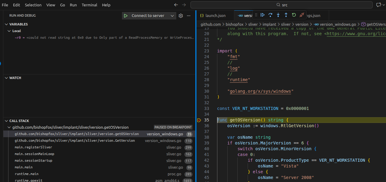 Inside VSCode run sliver server in debug mode by clicking Run and Debug > Launch server